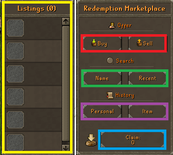SELL: Click this to list an item that you want to sell. BE SURE TO DOUBLE CHECK THE PRICE BEFORE YOU LIST IT. If you are trying to list an item for 2B, instead of typing out all the zeros, type "2b" for the price. Same for millions: "200m" will list the item for 200m.