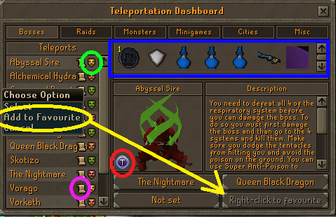 Favorite Teleports(YELLOW) - Right click a teleport option and choose "Add to Favourite" too add it to your list of favorites.